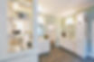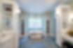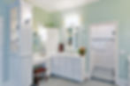 Clean white cabinetry, warm slate flooring, and storage space galore all score high on the function scale. Open shelving for favorite decorative memories, soft sage walls with crisp white linen trim, and a bathtub fit for a queen add to the pretty quotient.